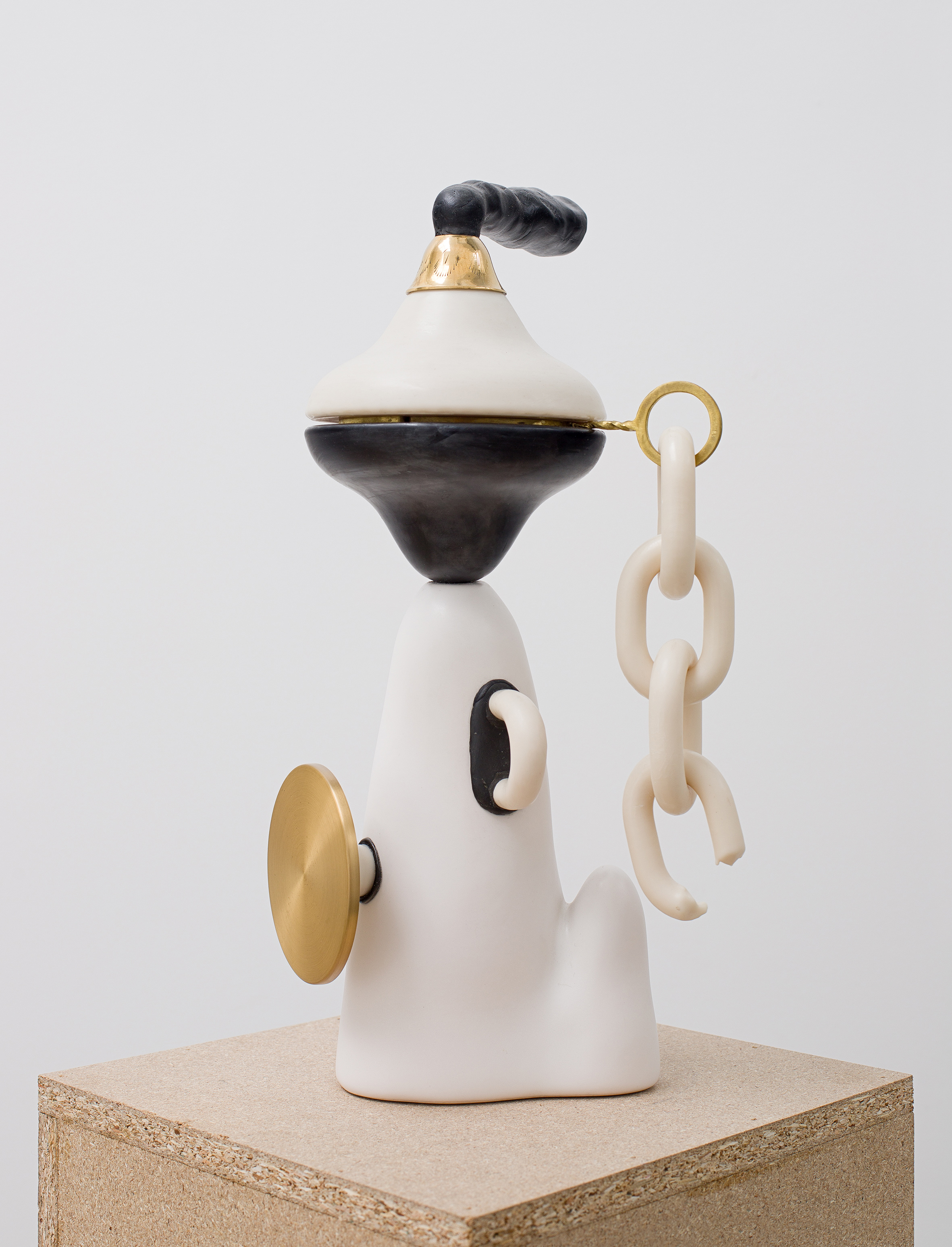 Ceramic, thermoplastic, found objects, brass, epoxy